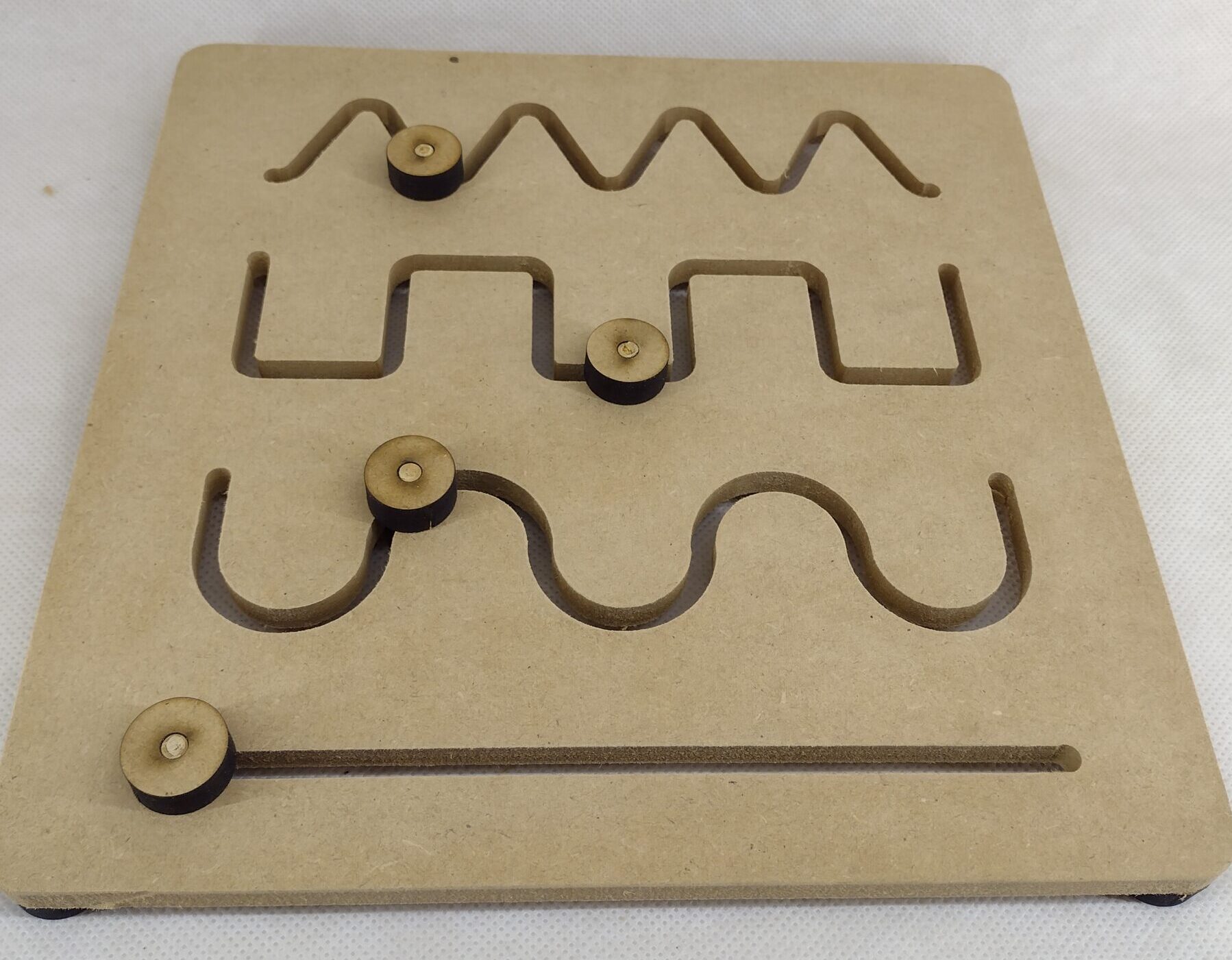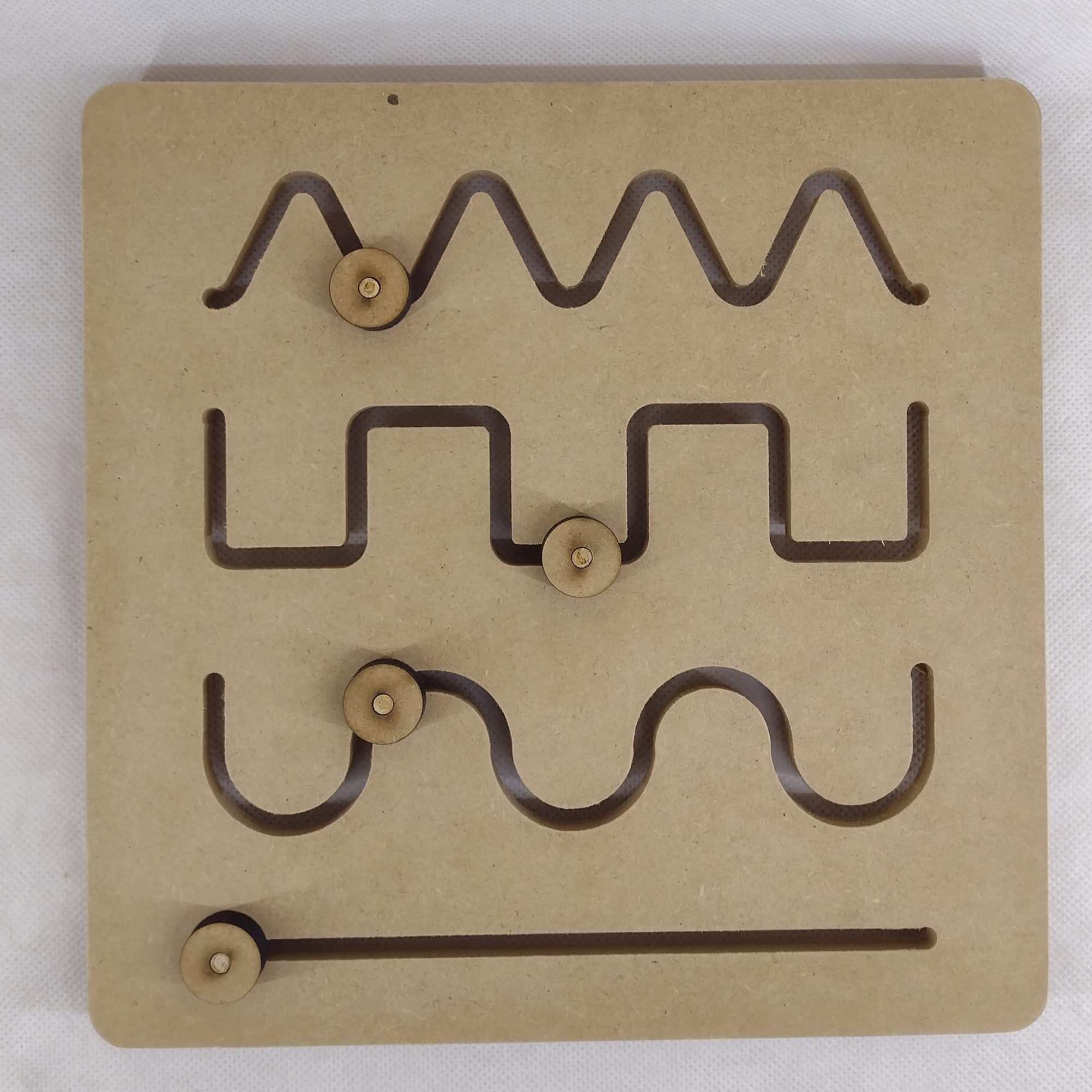 El panel con caminos desarrolla la psicomotricidad y la coordinación oculomanual de los niños. También estimula las habilidades sensoriales y motoras.