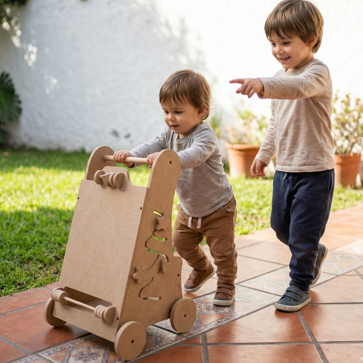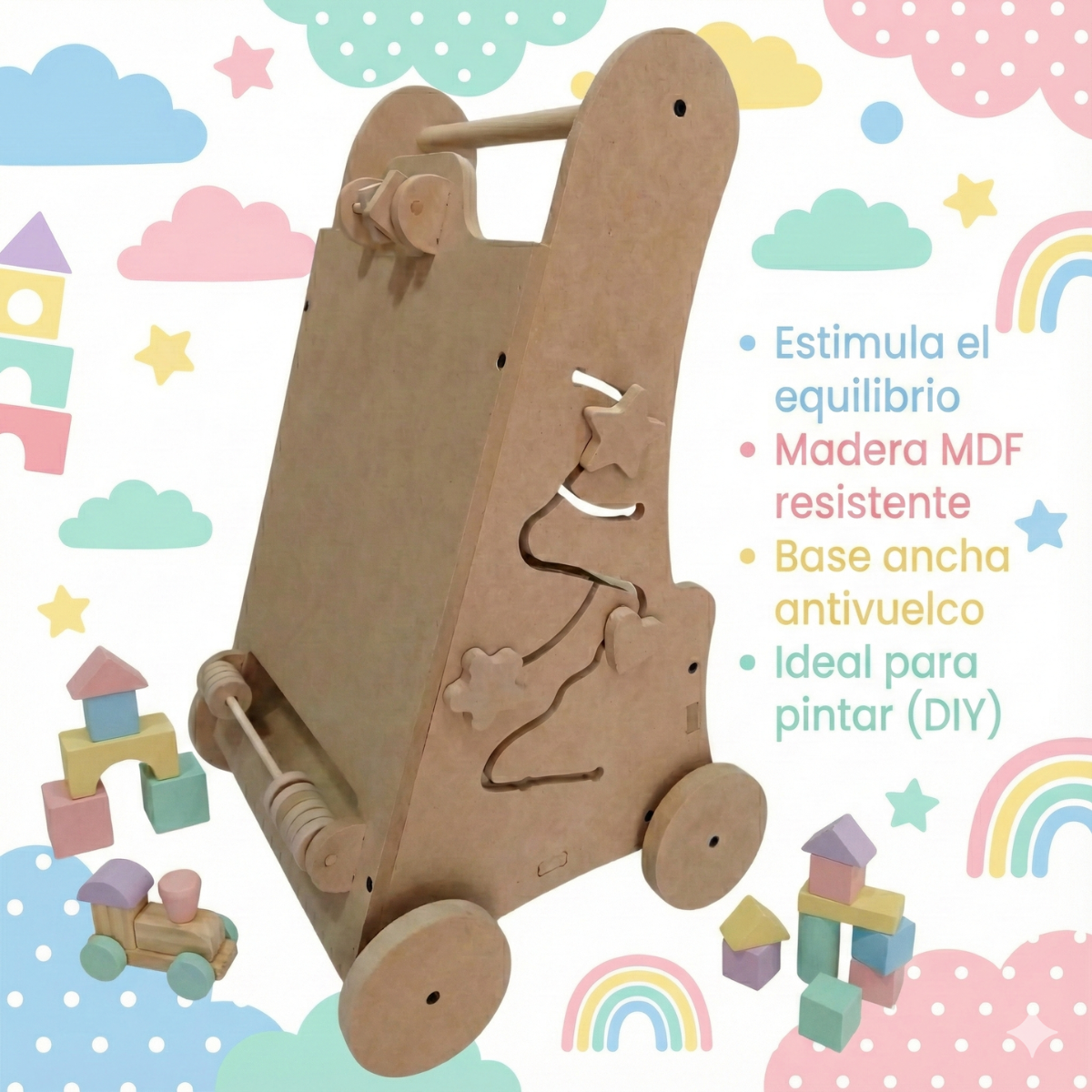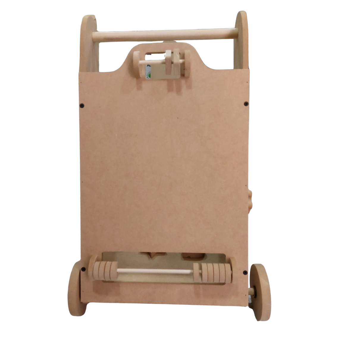 Es un andador de estructura firme fabricado en MDF de primera calidad. Su diseño de base ancha y caja contenedora permite que el bebé se apoye con seguridad sin que el caminador se vuelque.