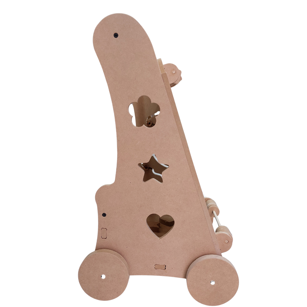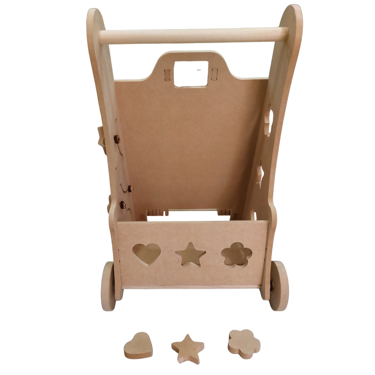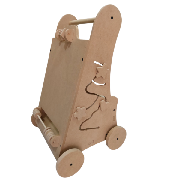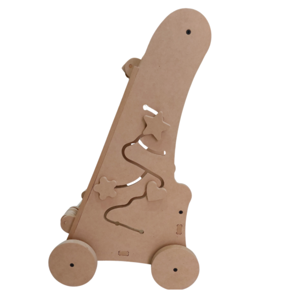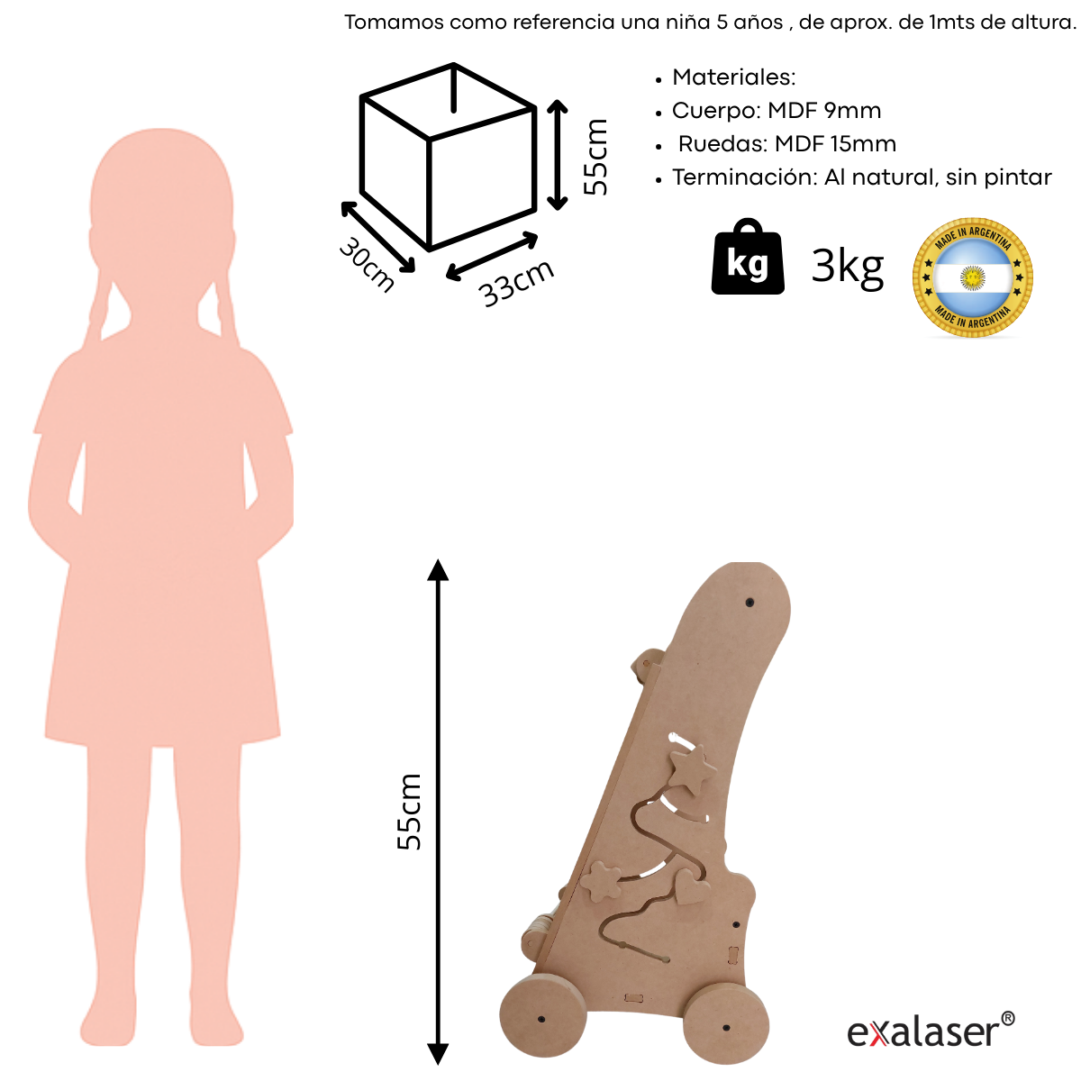 Es un andador de estructura firme fabricado en MDF de primera calidad. Su diseño de base ancha y caja contenedora permite que el bebé se apoye con seguridad sin que el caminador se vuelque.