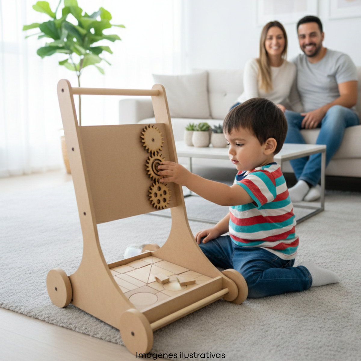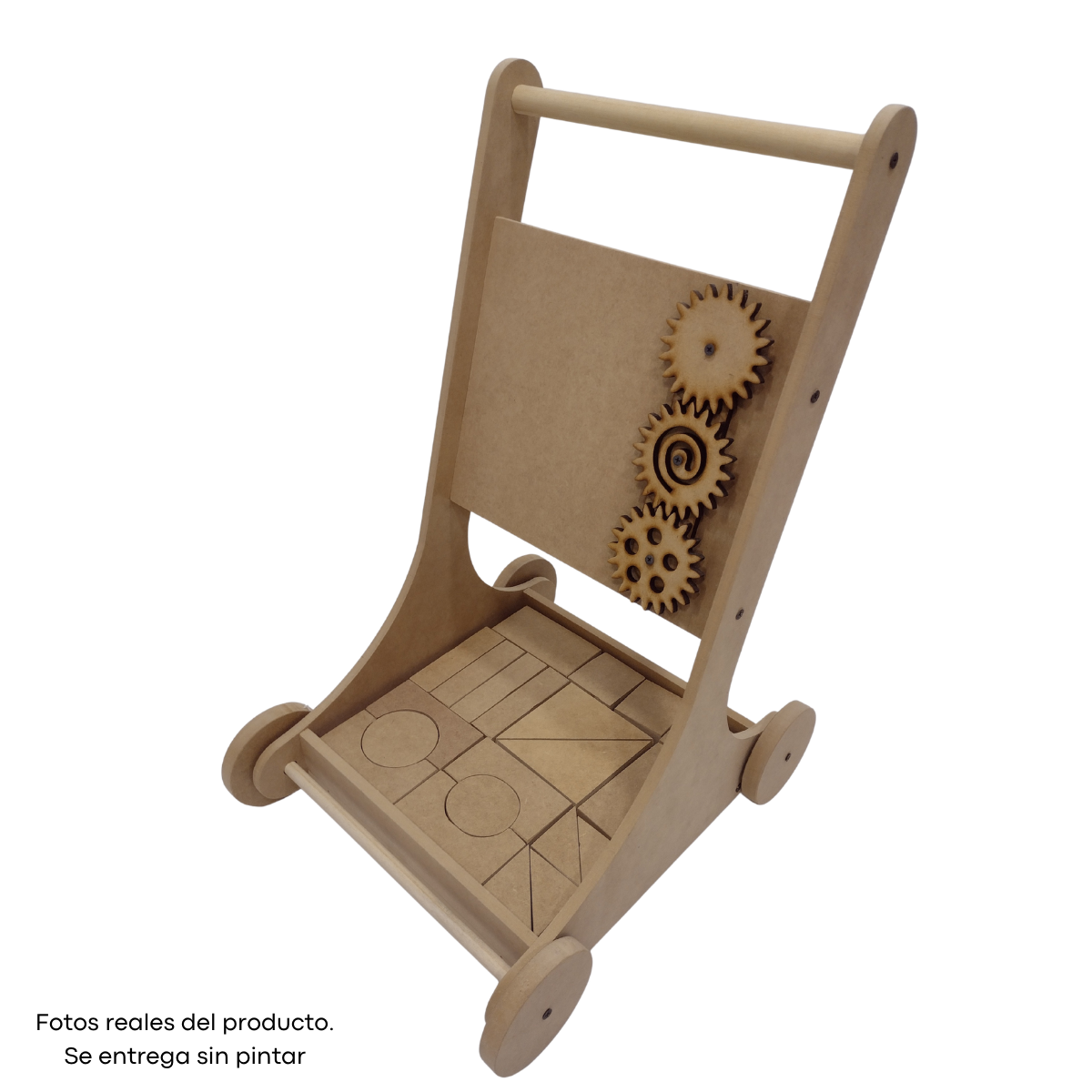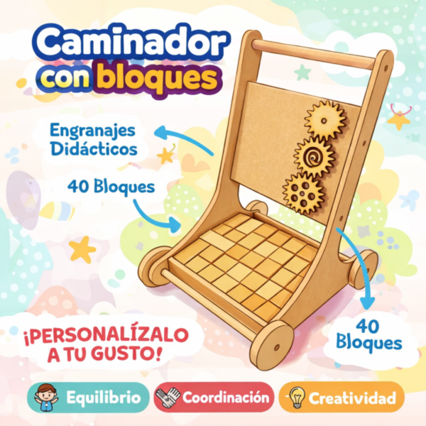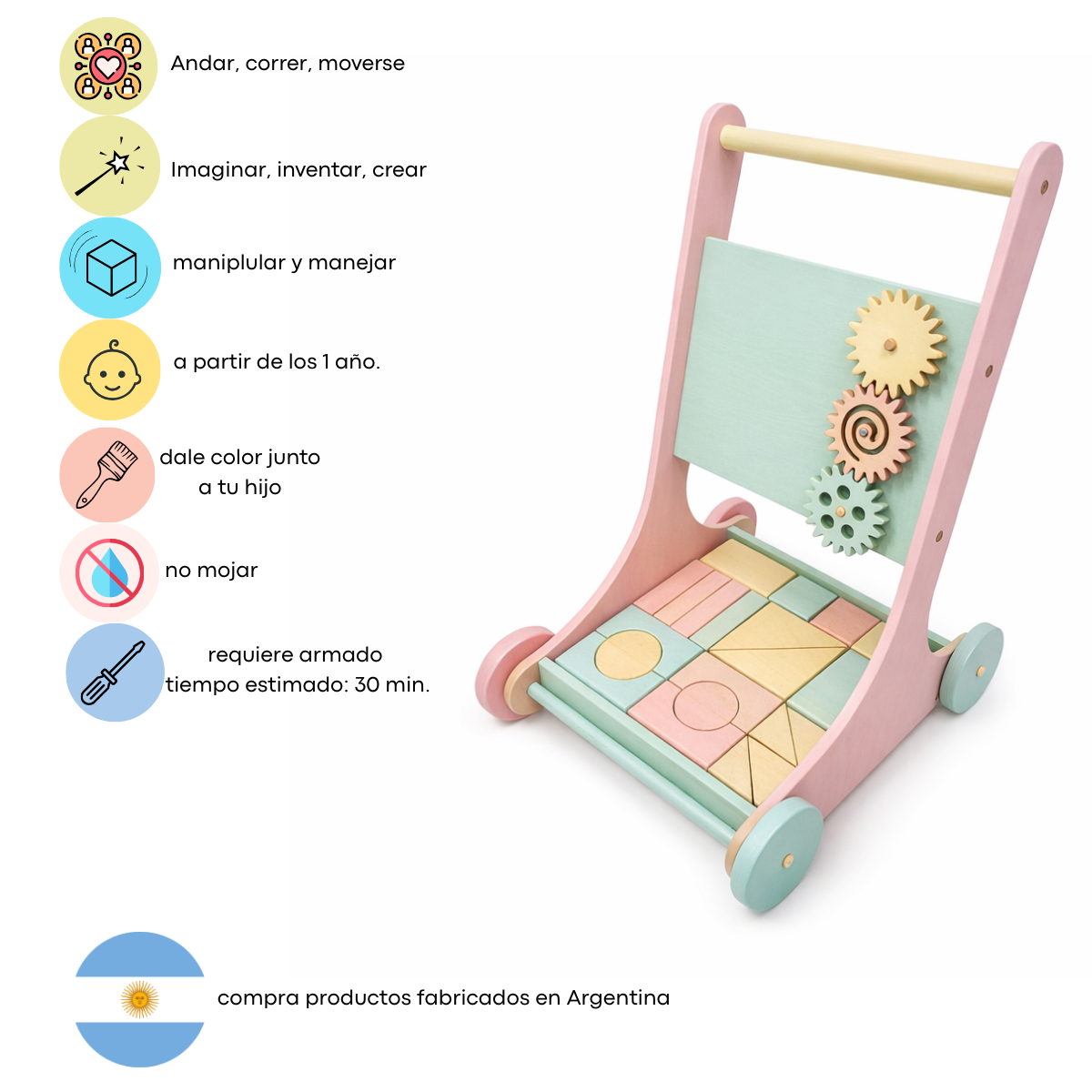 Caminador / Andador Valentino con 40 bloques. Tablero con engranajes giratorios y espacio libre para personalizar. Medidas 40x33x55cm