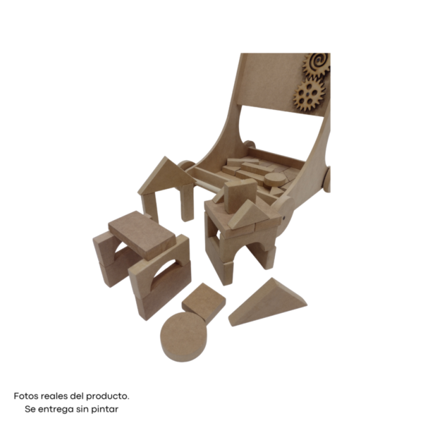 Cuerpo fabricado en fibrofacil de 9mm de espesor / ruedas: fibrofácil de 15mm / ejes: varilla de madera de 12mm / manija: varilla de madera de 18mm. / 40 bloques de fibrofacil de 18mm /juego de engranajes giratorio fibrofacil 6mm.