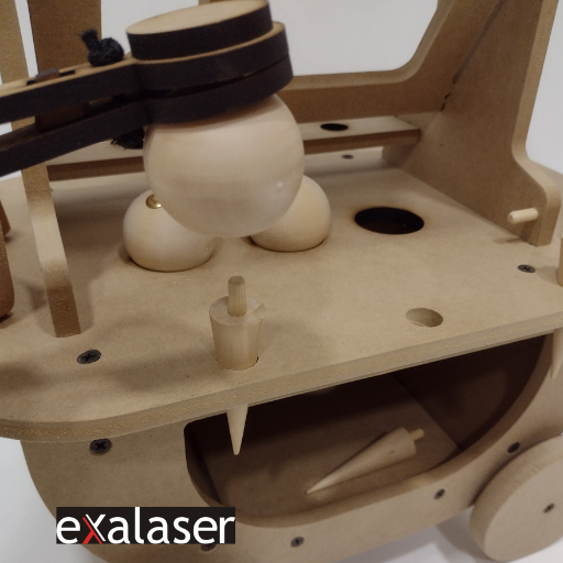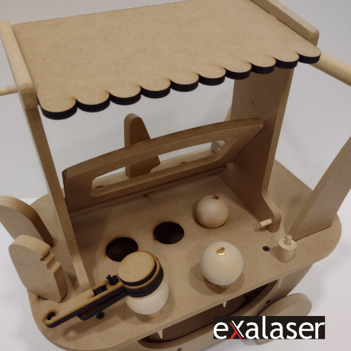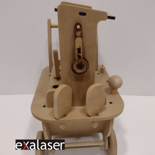Cuerpo fabricado en fibrofacil de 9mm de espesor, ruedas: fibrofácil de 15mm , ejes: varilla de madera de 12mm, manija: varilla de madera de 18mm.
