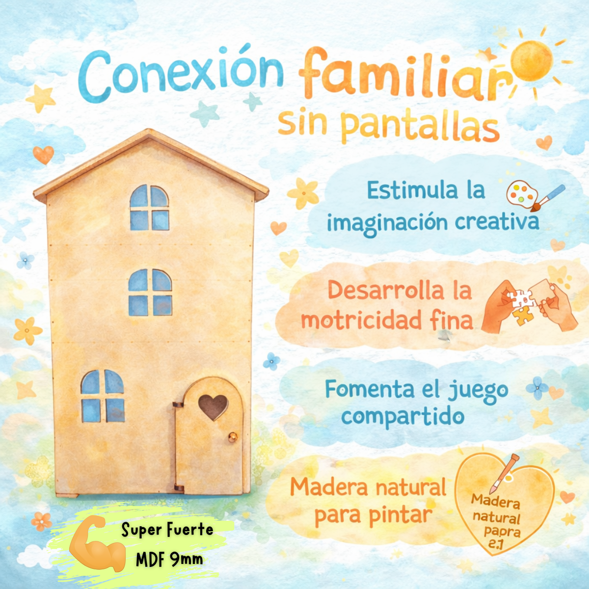 El producto se entrega sin pintar, lista para ser disfrutada tal cual o para transformarse en un proyecto artístico familiar, permitiendo que cada familia la personalice con sus propios colores y estilo.