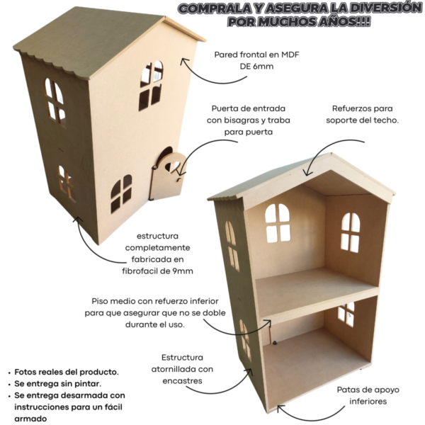 Calidad y Proceso de Fabricación Fabricada en MDF de 9mm, le damos importancia a la robustez del producto; colocamos refuerzos en zonas de apoyo de los niños y una estructura creada con encastres y atornillada, asegura un producto duradero para ser utilizado por muchos años.
