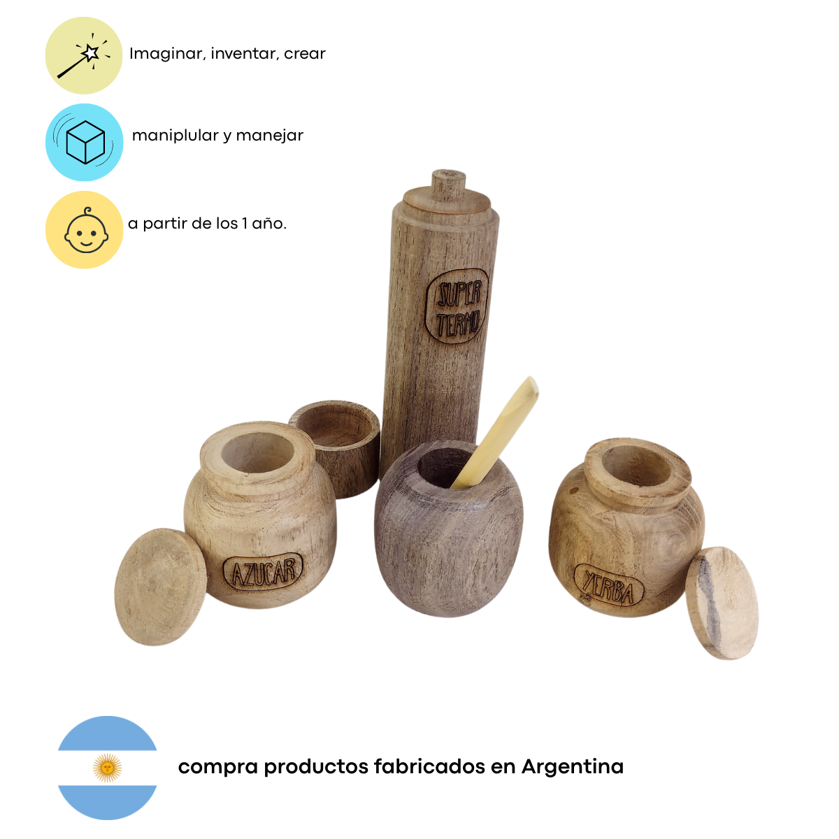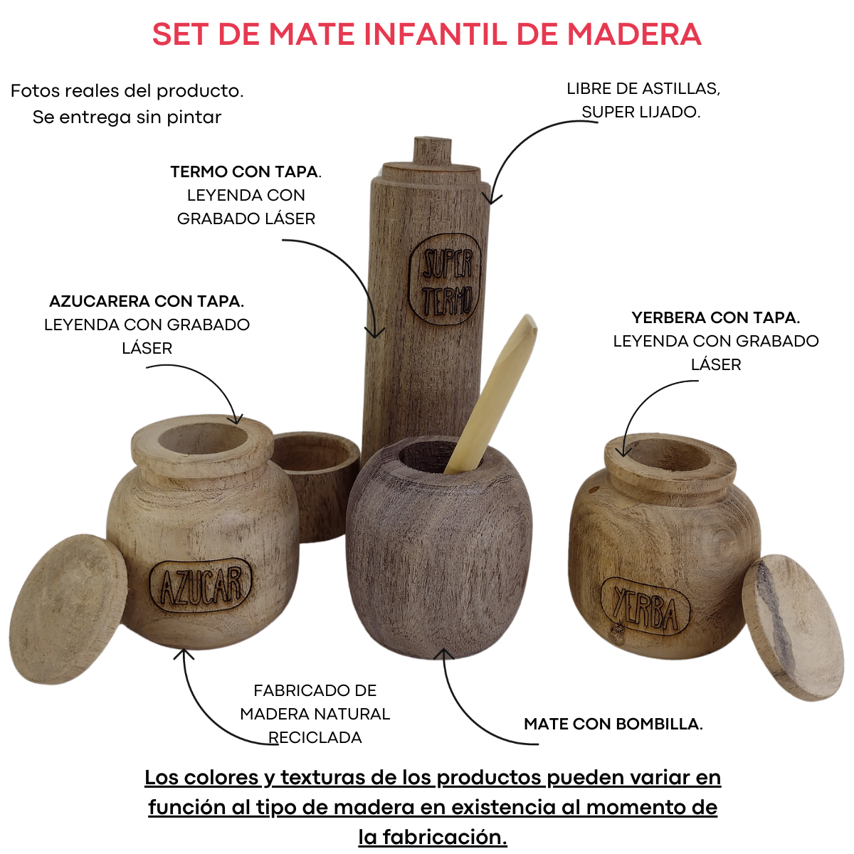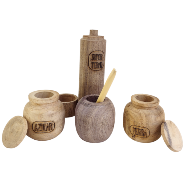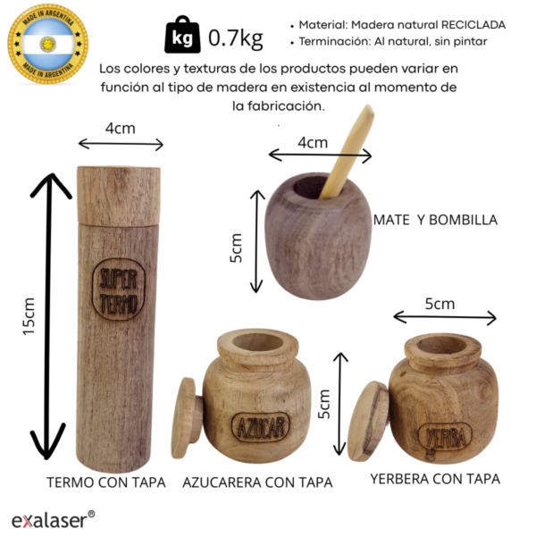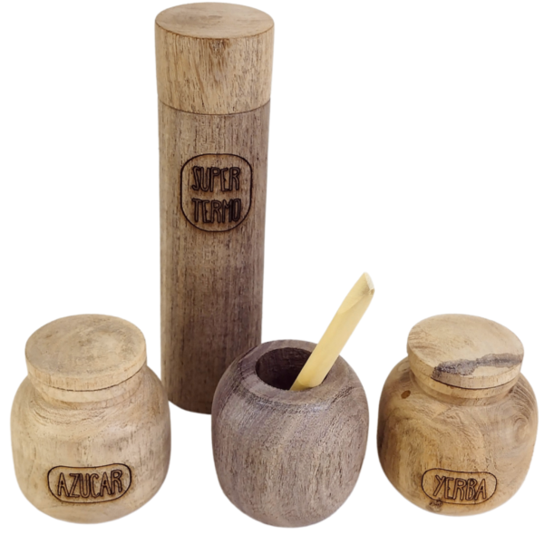 Incluye: 1 Termo, 1 Mate, 1 Bombilla (madera), 1 Azucarera con tapa, 1 Yerbera con tapa.