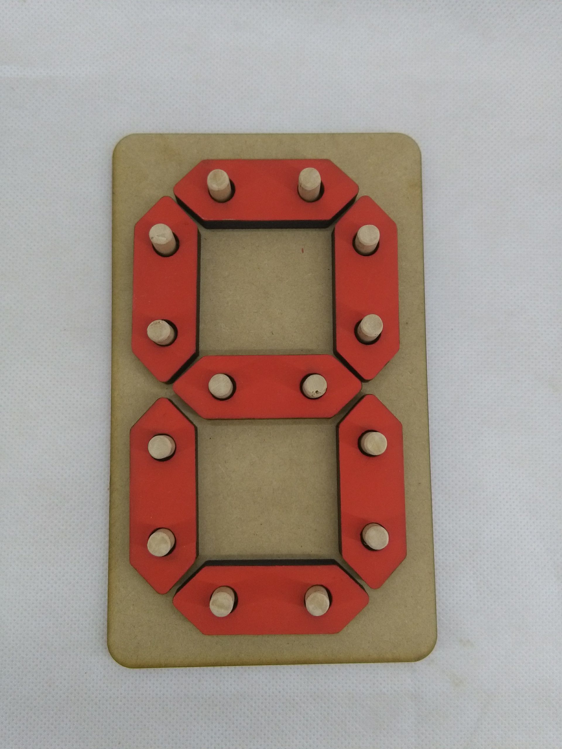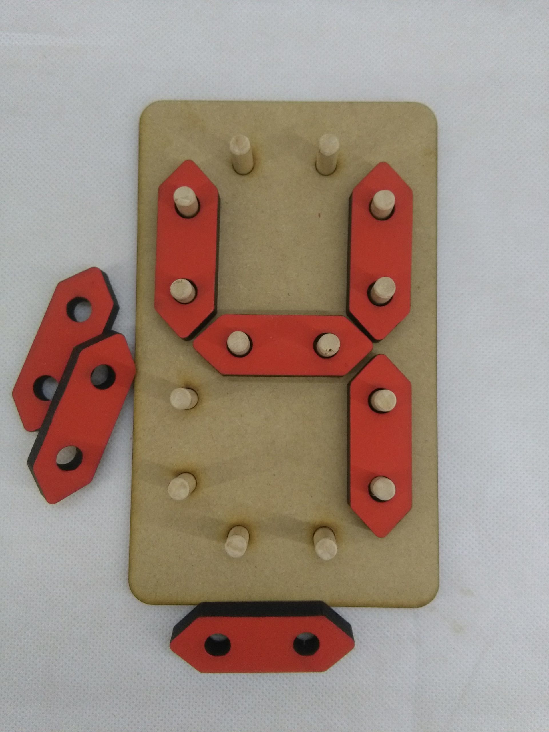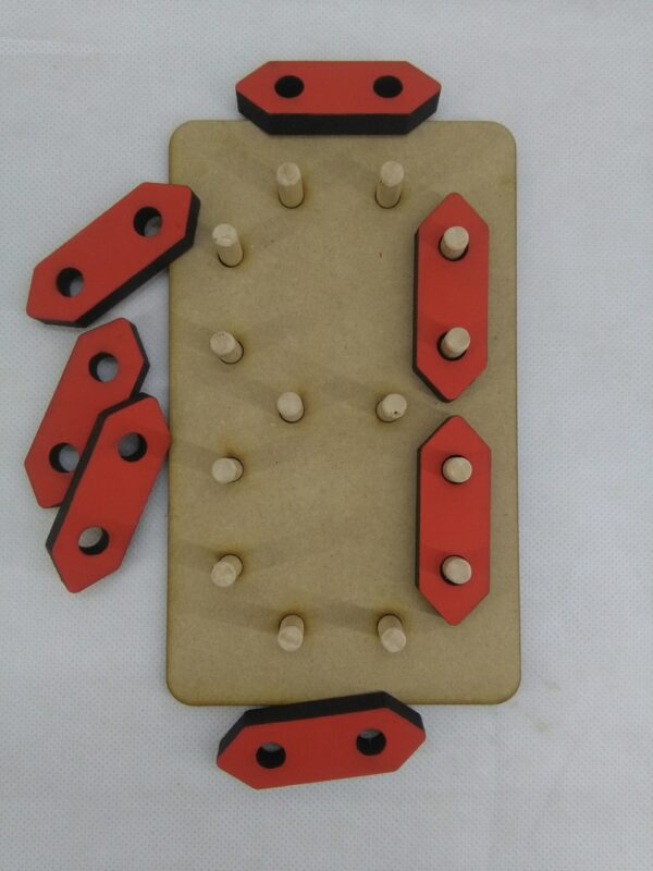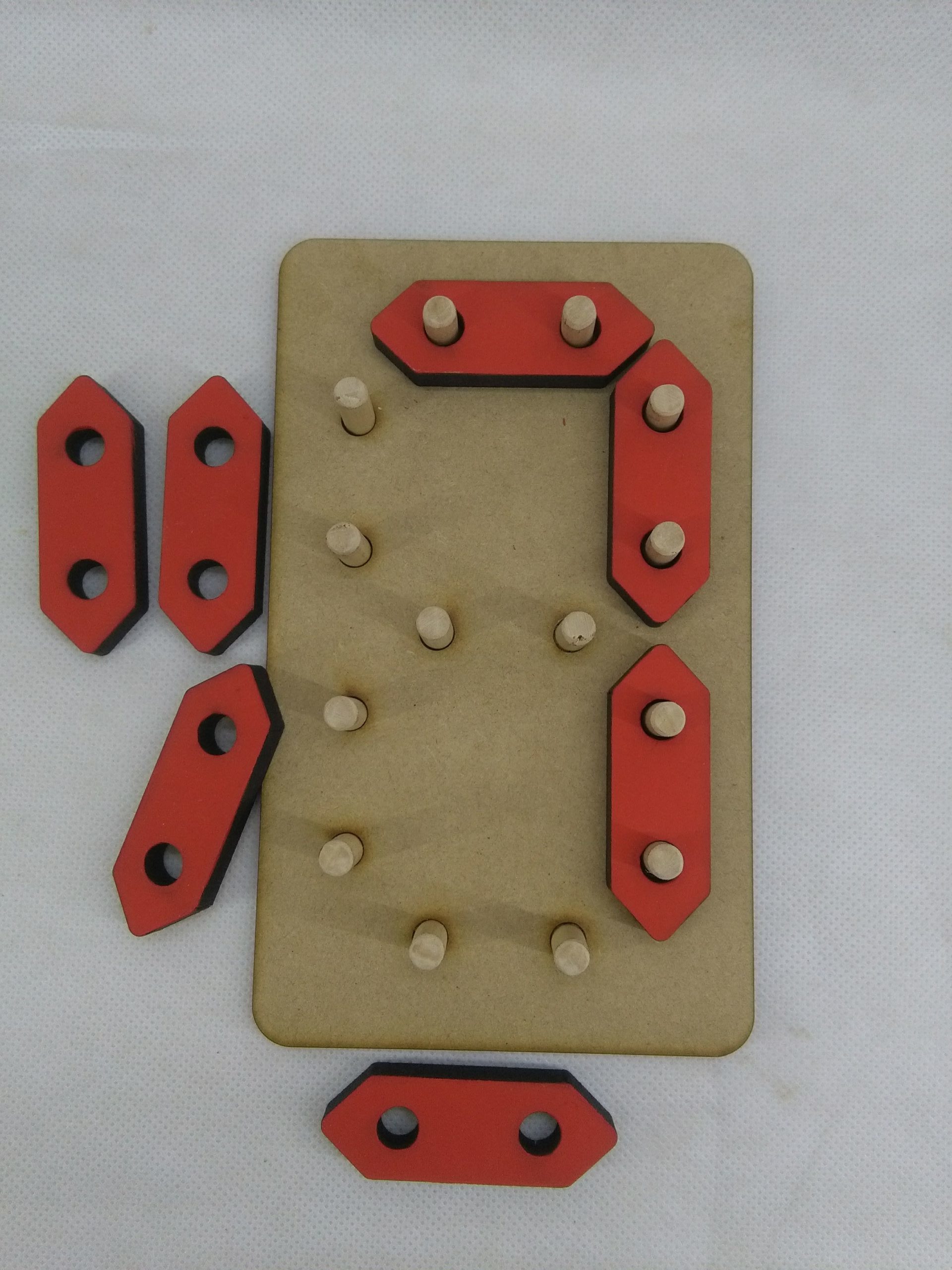 La base fabricada en fibrofacil de 6mm de espesor. Piezas en fibro de 9mm de espesor (Se entregan sin pintar). Tarugos diámetro 8mm